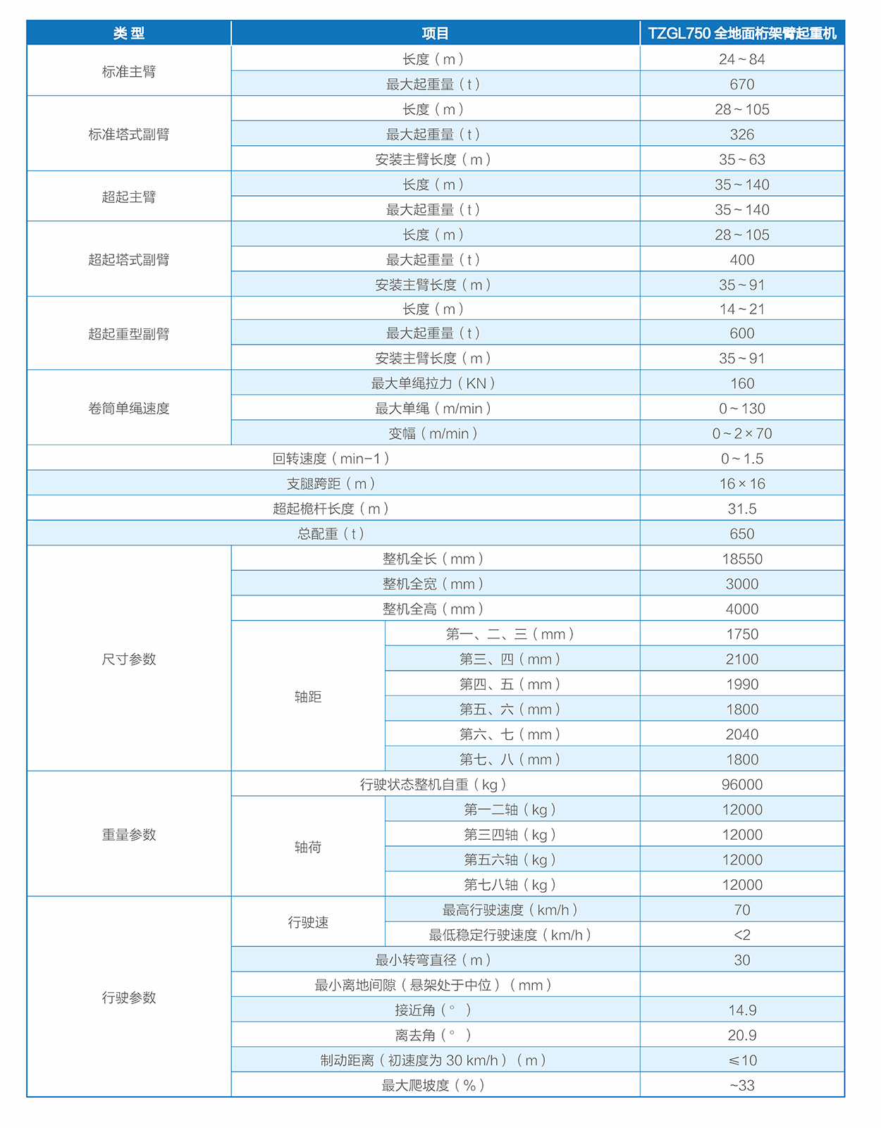 TZGL750全地面桁架臂起重机是国内首创机型,集桁架臂的超强起重能力与全地面底盘的快速转场特点于一身,可广泛应用于风电建设、桥梁建设、石油化工、市政工程等吊装领域。