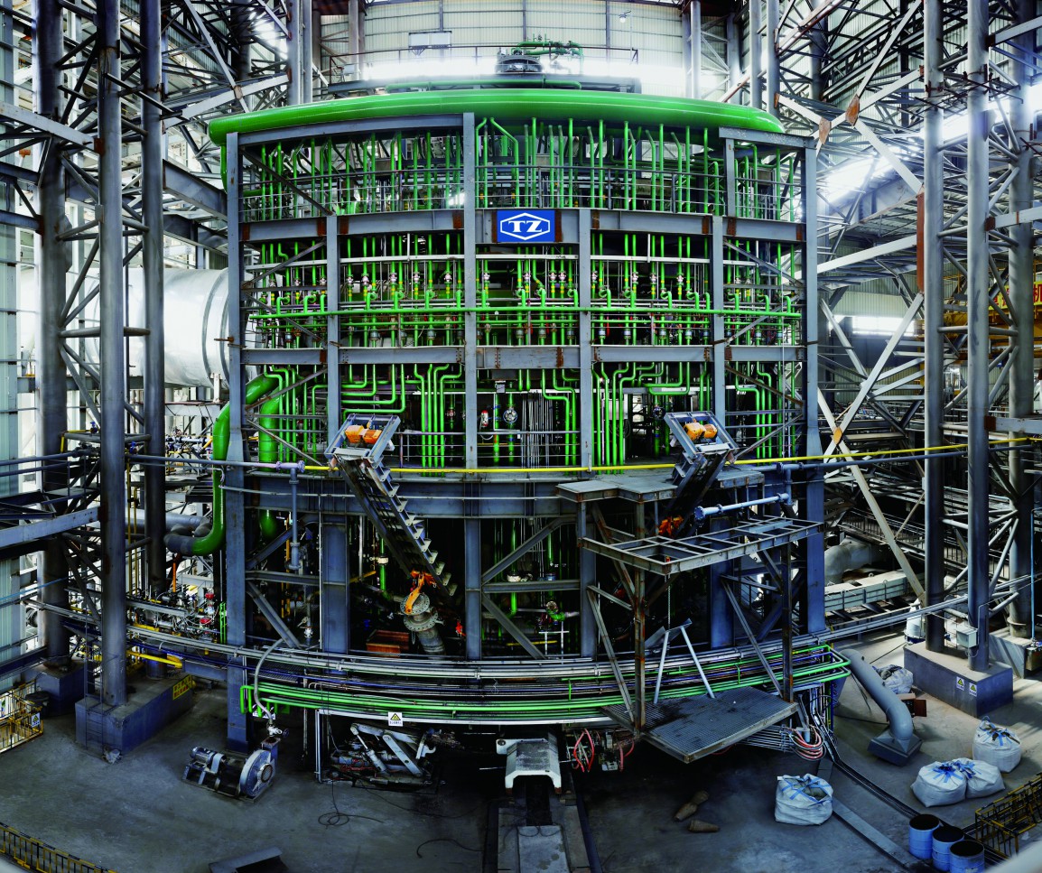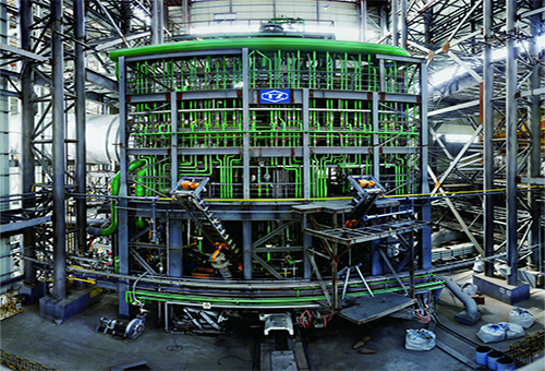 是一种熔融还原炼铁装置。该设备包含的部分有筒体、渣区冷却壁和前置炉。筒体包含炉体段和煤气室,直段直径为Φ9280mm。煤气室直径为Φ5260