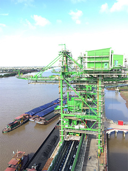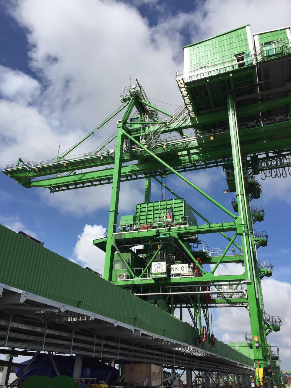 桥式抓斗卸船机,以带有抓斗的小车沿桥架作周期运行的散货卸船机。作业时,抓斗自船舱抓取散货并提升出仓后载重小车向岸方运行,将散货卸入前门框内的漏斗内,经胶带输送机系统送入货场。