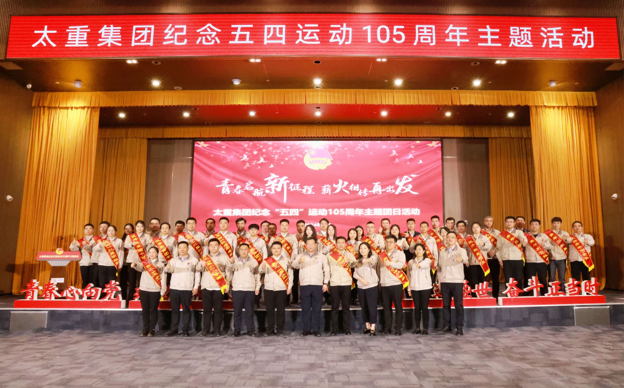 活动现场气氛热烈,处处洋溢着属于青年人的朝气蓬勃和意气风发,一台生动的情景剧《时空对话》将所有人拉回了那段激情燃烧的岁月。音韵和谐、朗朗上口的音乐快板《青春太重》,形象展示了太重青年踔厉奋发、勇毅前行的拼搏故事。舞蹈《五四、向前》突破语言文字的羁绊,以灵动的舞姿感受青春的力量,重温党带领青年运动的光辉历程。青年技能绝活秀环节,工程机械公司挖掘机驾驶员在线演绎用挖掘机铲斗点燃打火机,能源中心水、电、气输配工现场盲背智能高端装备产业园区水、电、气管网管线相关情况,笃定的眼神、自信的神态,无不展现出太重职工的铿锵风采。在全国青年岗位能手标兵宋志伟的领誓下,全体人员重温入团誓词、感悟初心使命,以此号召广大团员青年弘扬五四精神,以先进为榜样,在制造强国、工业振兴的赛道上奋力奔跑、挥洒汗水。