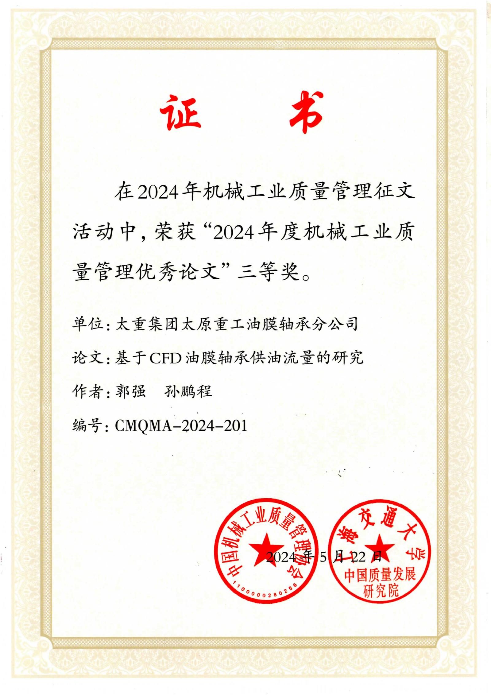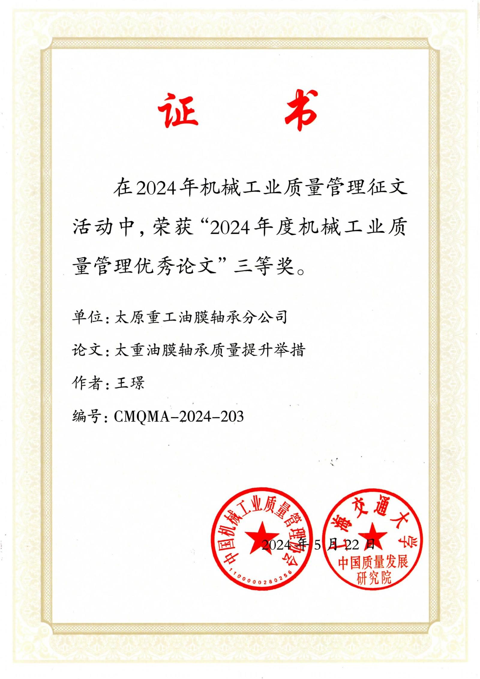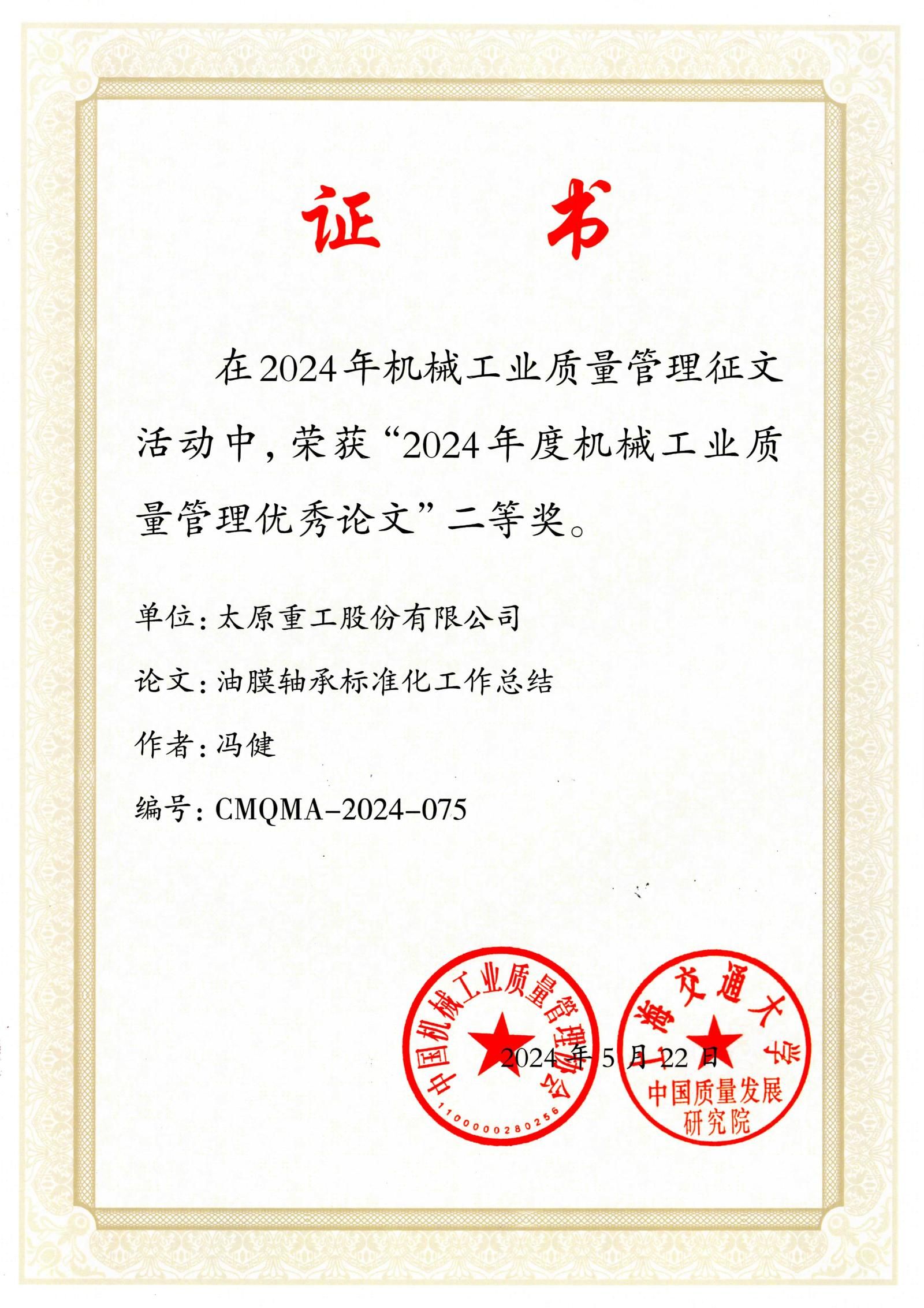 近日,中国机械工业质量管理协会与上海交通大学中国质量发展研究院联合发布了“关于表彰机械工业质量管理优秀论文的决定”。在这次备受关注的评选中,太重集团凭借卓越的质量管理研究与实践成果,荣获3项二等奖和4项三等奖。