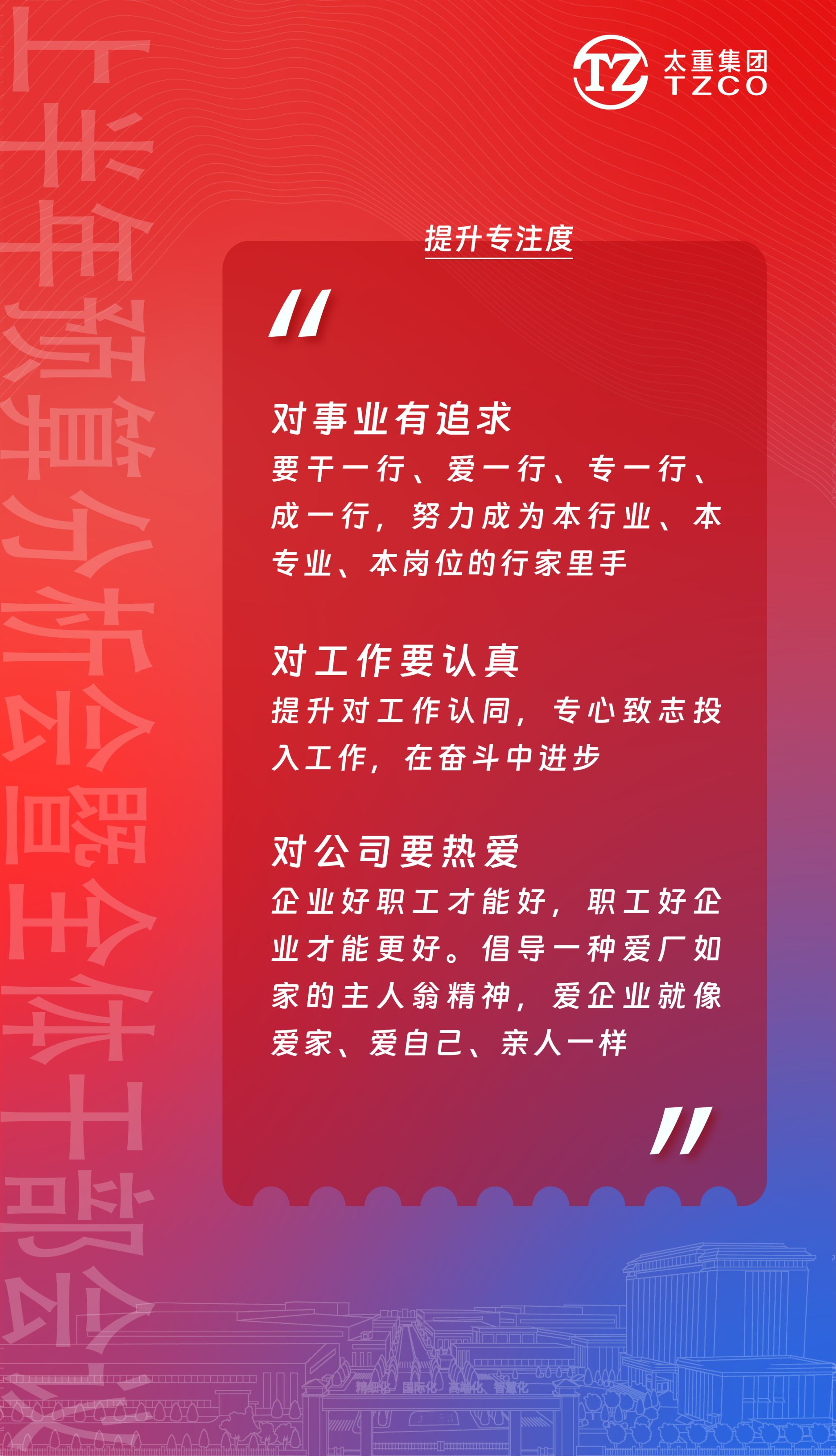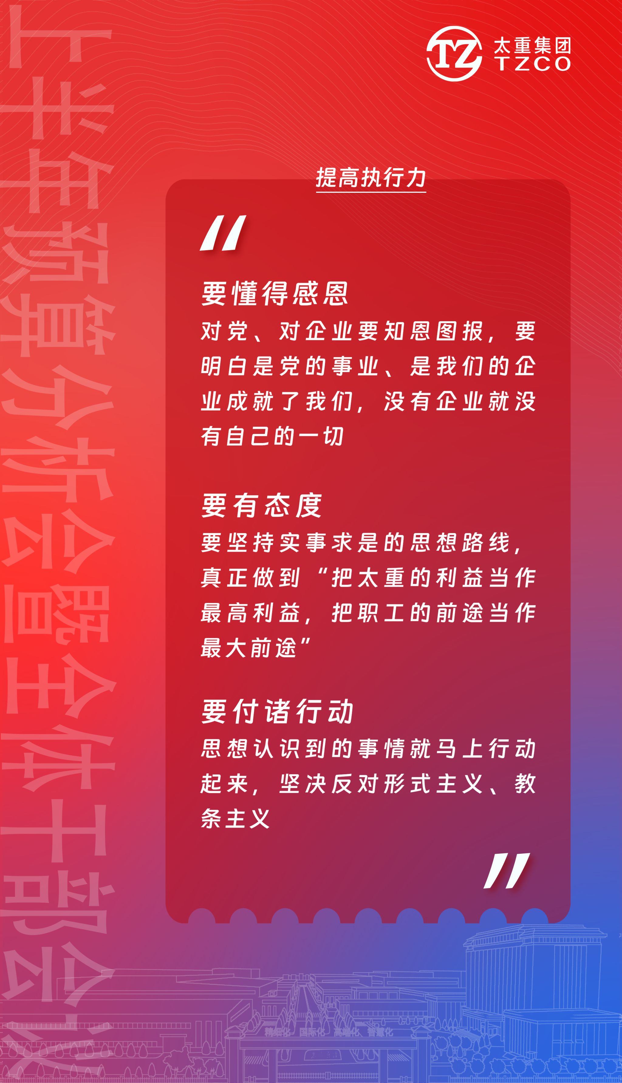 在建设新太重的伟大征程中,要有“舍我其谁”的魄力、有“必定成功”的信心、有“咬定青山不放松”的韧劲。