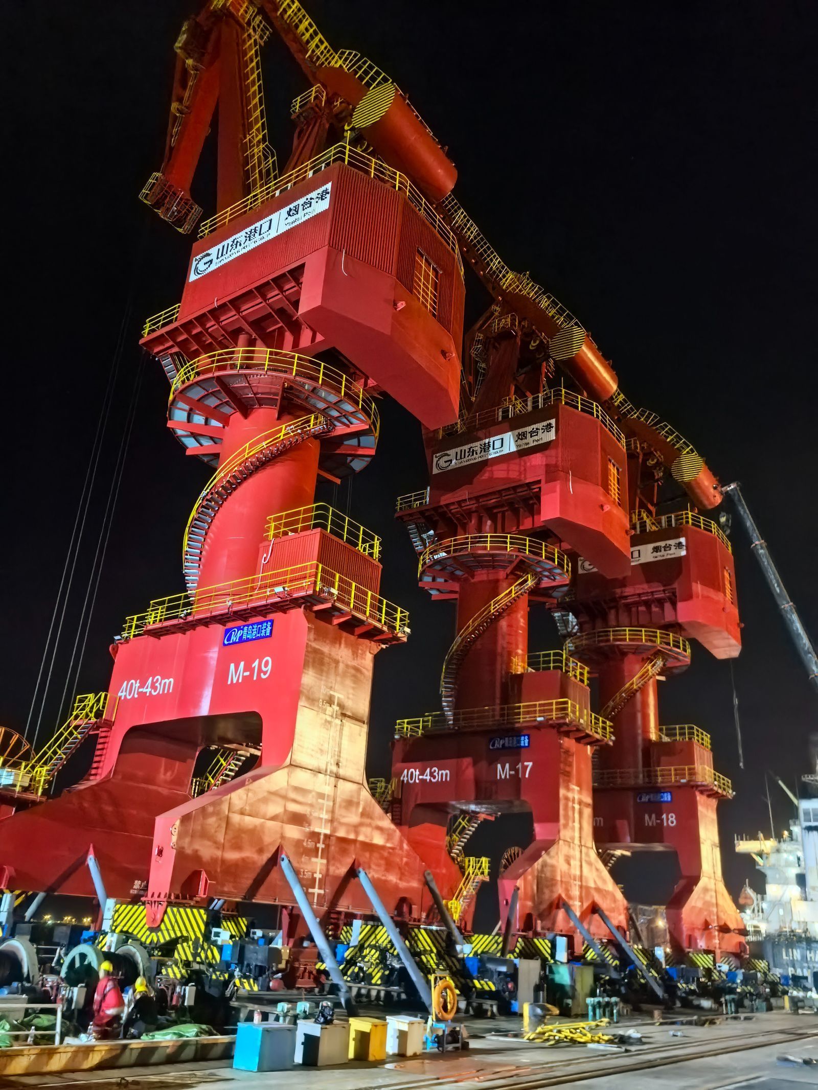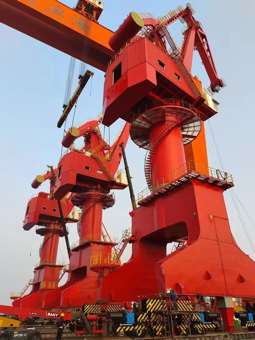门座式起重机,作为高效的全回转臂架型有轨起重机,服务于港口装卸及造船施工,是港口作业的主力设备。为满足用户实际使用要求,三台门座式起重机均搭载起重机监测管理平台——CMS系统。它作为港口机械的“智能管家”,可为用户提供详尽、实时的起重机状态和故障信息,是协助用户实现设备高效使用、故障检测和信息化管理的重要手段。以成熟的技术打造卓越方案,性能优越、高效稳定,尽显公司硬核实力。总装发运期间,公司与技术团队、用户紧密协作,创新采用双作业面策略,降低地面化组装难度,安装效率显著提升。历经15天昼夜奋战,成功完成3台起重机的核心部件总装,单台设备四连杆安装更是创下13.5小时新纪录,彰显了太重速度。有条不紊地吊装作业、聚精会神地滚装发运……工作人员精益生产、高效组织,经过100多天的默默付出后,“驯养员”终于让这三只“机械鹤”振翅离巢,向用户“飞”去。