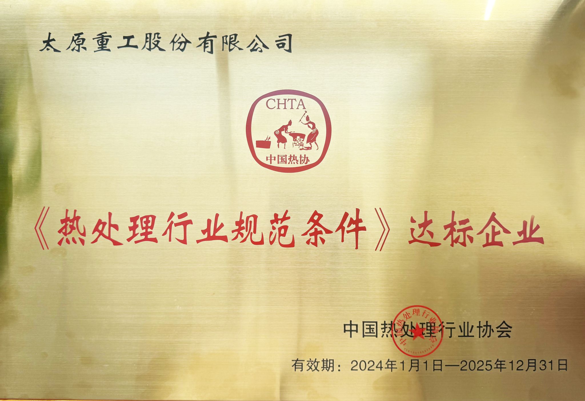 荣获“2024年全国《热处理行业规范条件》达标企业”称号,不仅是对公司过去努力的肯定,更是对未来发展的激励。下一步,太重将牢牢把握高端化、智能化、绿色化发展脉搏,不断优化工艺流程、提升产品质量、降低能耗排放,为实现热处理行业的绿色低碳高质量发展贡献更大力量。