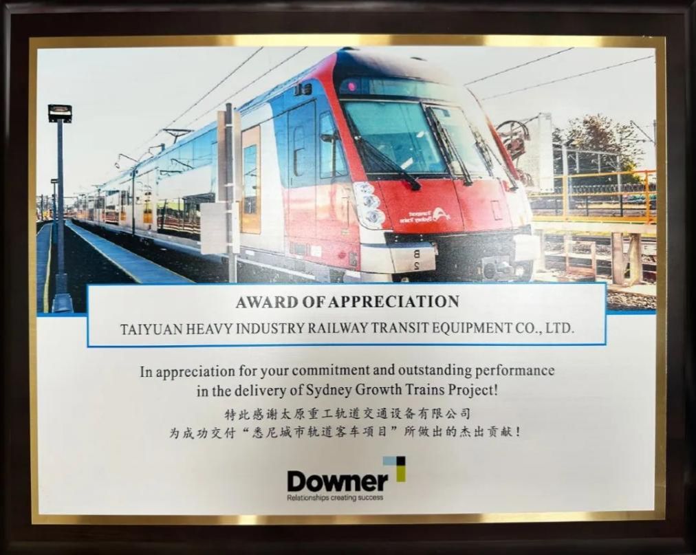 近日,公司收到一枚来自澳大利亚Downer公司的感谢奖牌,对轨道公司为“悉尼城市轨道客车项目”成功交付做出的杰出贡献表示感谢,为太重雄厚的技术和专业的服务点赞,并对未来的长期合作表示期待。