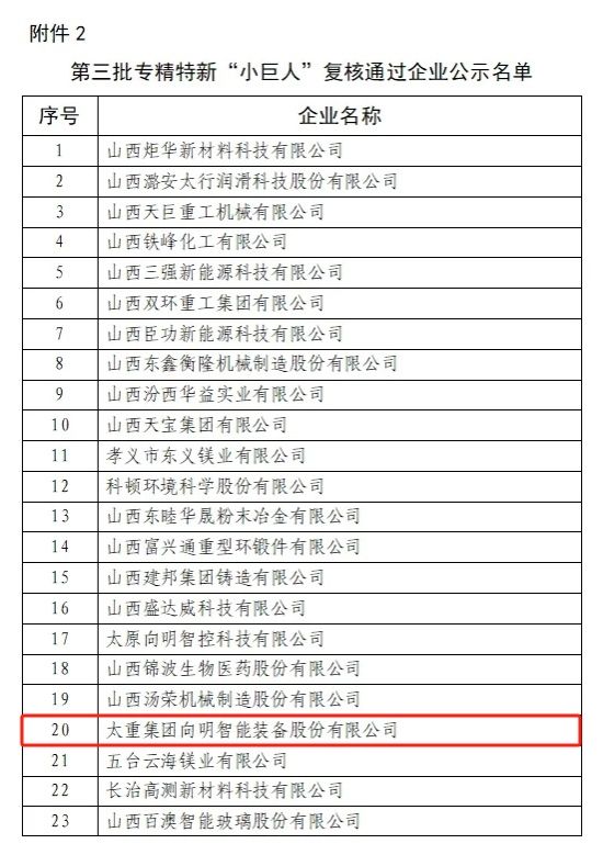 太原重工轨道交通设备有限公司成功入选第六批专精特新“小巨人”企业,这是轨道公司继2022年入选山西省专精特新企业后,完成的又一次荣誉进阶。如果说“灯塔工厂”是行业标杆引领,那这份来自国家级的认可同样分量十足。此外,在此次的名单中,太重集团向明智能装备股份有限公司顺利通过第三批专精特新“小巨人”企业复核。