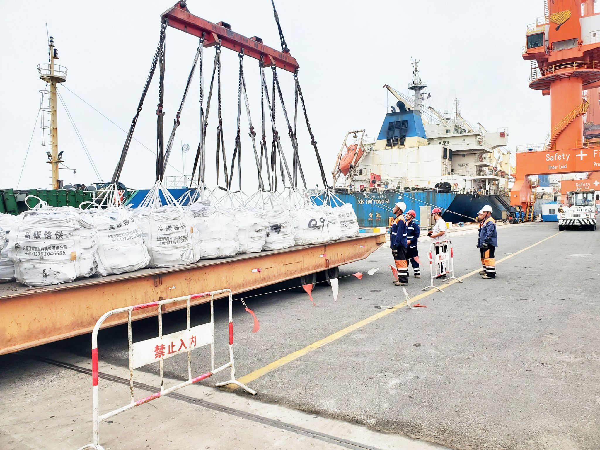 铬铁,作为炼钢的重要合金添加剂,每块重量都将近15公斤,主要用于不锈钢、特钢的冶炼,进而用于航空、宇航、造船及国防工业领域等国民经济基础性行业,市场需求量极大。虽然它的价值高达8000-8200元/50基吨,但是由于其形状不规则、包装易破损,运输和装卸工作要求很高,是每个码头都不能小觑的难题。然而,在太重滨海重装码头,这个问题却并非难事。