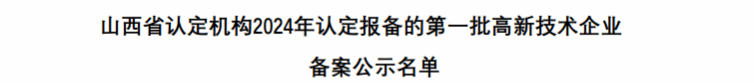 近日,全国高新技术企业认定管理工作领导小组办公室,正式发布《对山西省认定机构2024年认定报备的第一批高新技术企业进行备案的公告》。
