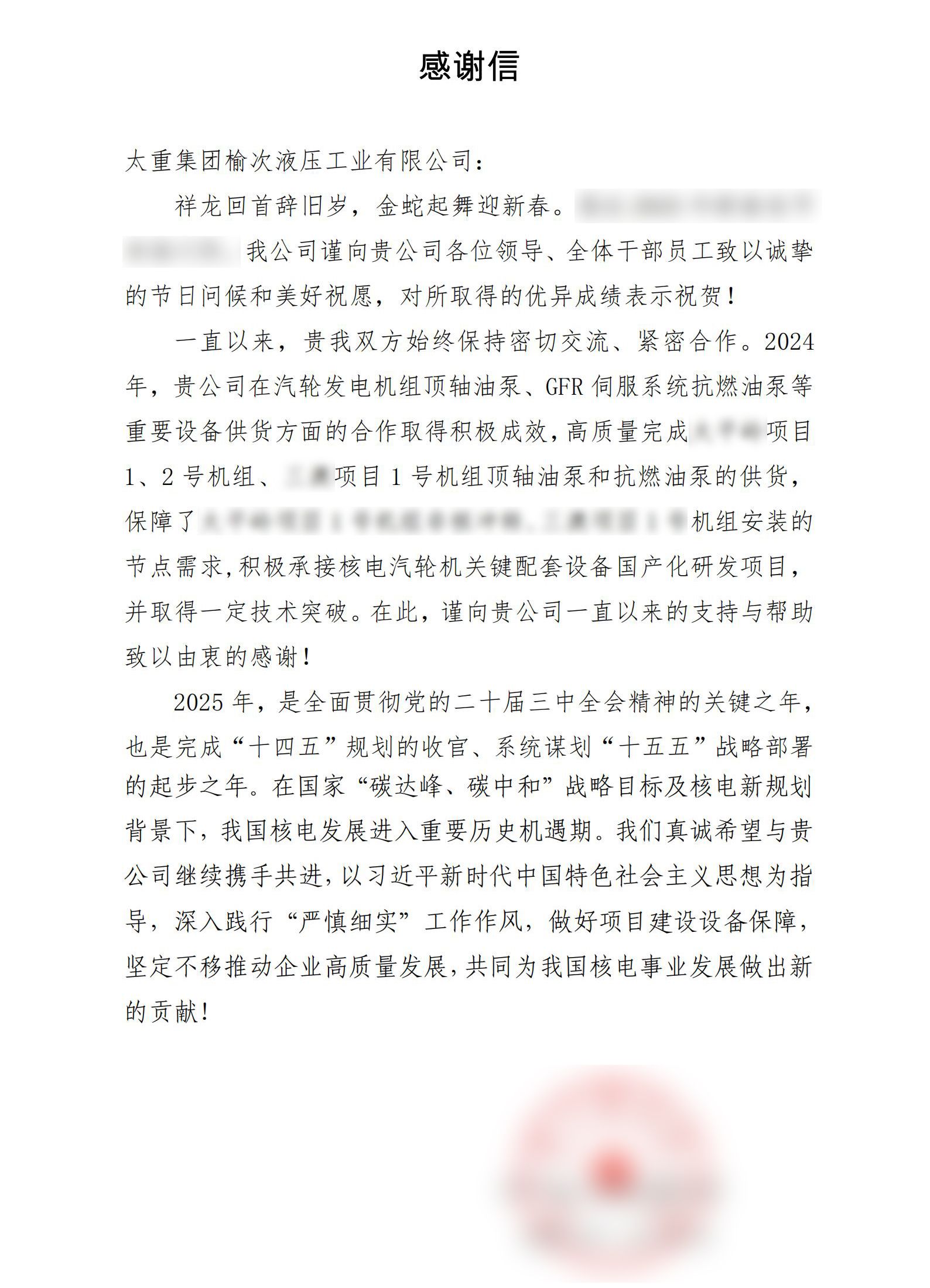 近年来,我国核电产业迎来重大发展机遇期,但部分关键设备依赖进口,不仅成本高昂,还面临技术封锁、供应受限等风险。该用户在核电领域深耕多年,拥有丰富的项目经验和广阔的发展前景,与太重有着多年的合作基础。此次,太重榆液肩负重任,负责用户汽轮发电机组顶轴油泵、GFR 伺服系统抗燃油泵等重要设备的研发设计工作,其性能和可靠性直接影响整个核电系统的安全稳定运行。太重榆液承接此次任务,不仅是双方深厚合作友谊的体现,更是太重推动我国核电关键设备国产化进程贡献力量的重要契机。交给太重,请用户放心!自项目开工,公司面临着多方面的挑战与困难,时间紧、任务重、标准高。为用户设计制造关键设备时,公司坚持自主创新,突破工艺瓶颈,解决了一系列技术难题,形成了一套成熟的技术工艺,实现了核电领域关键设备国产化技术突破,为国产化替代奠定了坚实基础。在生产制造期间,公司不折不扣遵循“严之又严、慎之又慎、细之又细、实之又实”的核安全工作要求,各部门联动配合,制定了详细的进度计划和应急预案,解决了一个又一个组织难题,攻克了一道又一道生产难关。目前,太重榆液研制生产的相关产品已应用在用户多个核电项目上,为我国核电事业高质量发展赋能。方寸之间,纸短情长。这封感谢信,不仅承载着太重为我国核电事业主动作为的无上荣光,也见证了太重用心服务用户,全力创造价值的温暖时刻,为新的一年开启了更具力量的新篇章,鼓舞公司向着“转型升级跨越”昂首阔步、砥砺奋进。