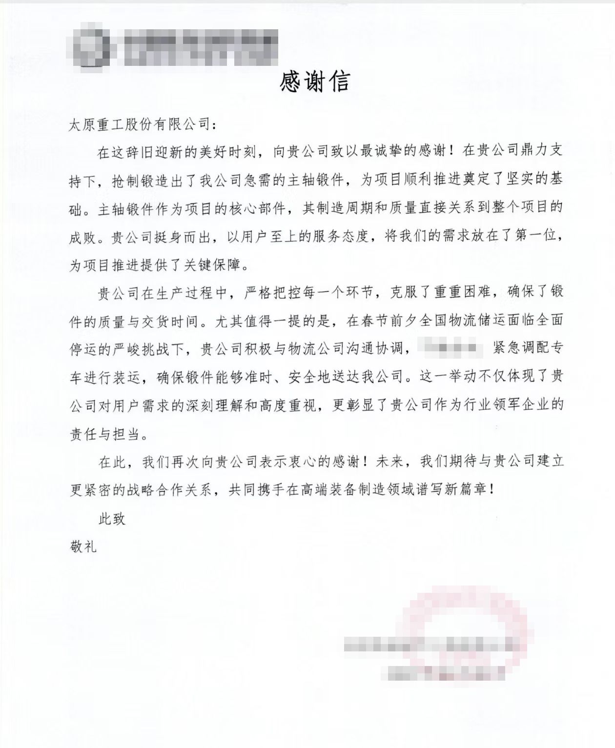 在这场紧急交付的“战役”中,全体职工齐心协力、众志成城,为用户提供了最优质的产品及全方位的服务,有力践行了“用户至上”的核心价值观。这封感谢信,是太重一诺千金的见证,是用户信任与支持太重品牌的最好诠释。未来,公司将持续奋进,不断提升服务质量,深入践行服务创新,以极致服务赢得用户信赖,与合作伙伴携手共进、互利共赢,共同书写合作发展的新篇章。