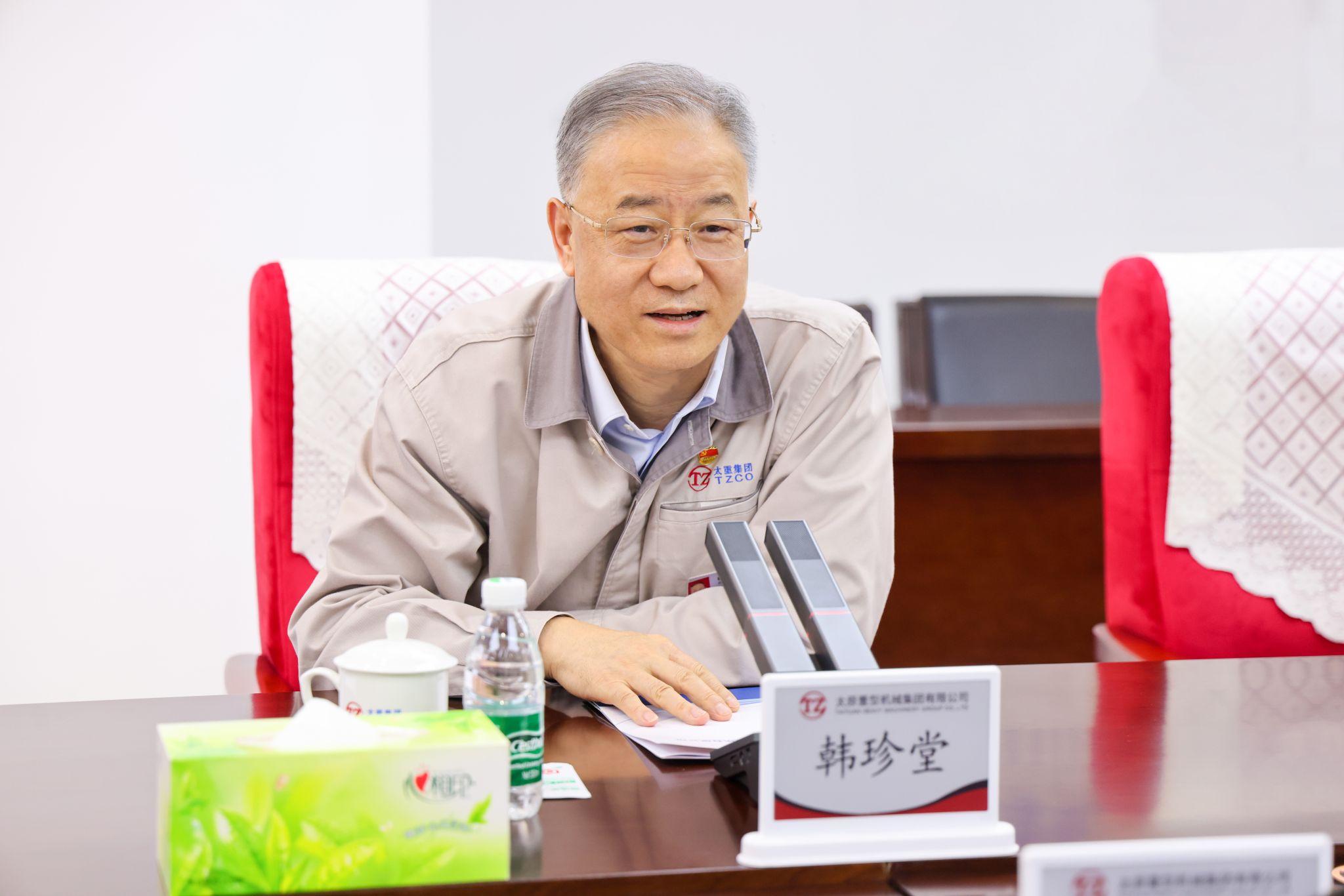 韩珍堂对高峰一行的到来表示热烈欢迎,并详细介绍了太重的发展历程、企业文化以及未来发展规划。他说,太重作为“共和国长子”,肩负大国重器的使命担当,与祖国同向同行。转型升级以来,太重开启了气势如虹的改革、创新和发展,进入了追赶超越的新阶段,正逐步向创造引领不断前行。近年来,太重持续加大研发投入,构建起“一重点、一中心、多基地”技术研发体系,创新优势不断转化为发展胜势,以“高端化、智能化、绿色化、国产化”为产品定位,不断推陈出新,越来越多的用户用上了国产化精品。同时,太重坚持全球化战略和国际化视野,深入推进国内外重点区域公司和维护中心建设,推动太重品牌扬帆出海。未来,希望能与太钢进一步开展多层次、宽领域合作,充分利用行业领先技术和地域优势,“一南一北”协同配合,深度合作推动山西制造业高质量发展,为谱写中国式现代化山西篇章作出更大贡献。