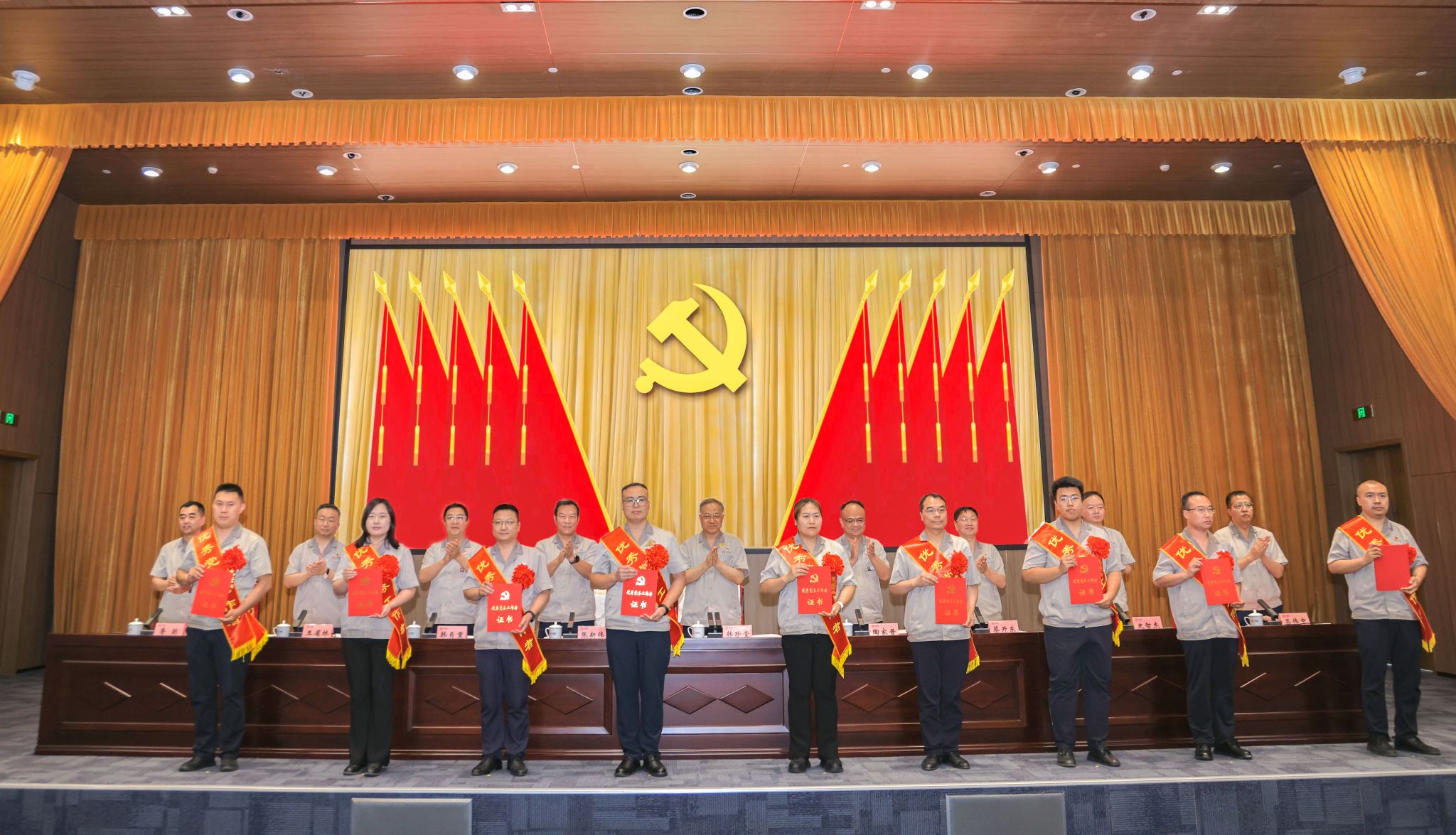 党徽熠熠生辉,旗帜鲜艳似火,大会在庄严的国歌声中拉开帷幕。集团公司党委副书记、副董事长、总经理陶家晋主持会议。公司党委专职副书记、副董事长张新伟宣读集团公司党委《关于表彰优秀共产党员、优秀党务工作者和先进基层党组织的决定》。“两优一先”代表们身披绶带、胸佩红花依次登台,公司领导为他们颁奖。