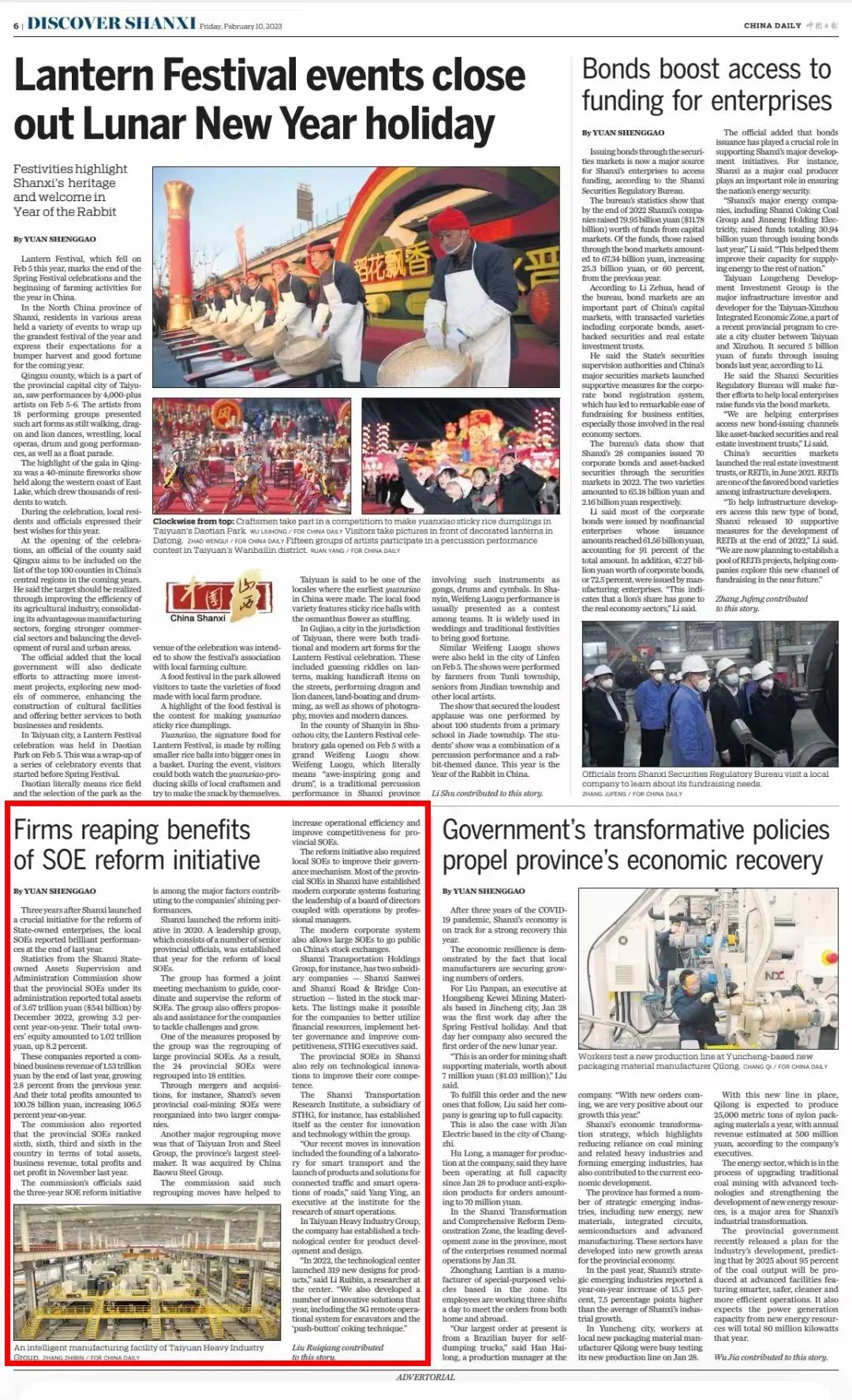 2月10日,中国日报全英文刊发《Firms reaping benefits of SOE reform initiative》文章,报道太重扎实推进国企改革三年行动,探索科技创新体系和高端装备制造产业深度融合的发展新路,营造了良好的创新生态,夯实了公司转型发展的坚实根基。