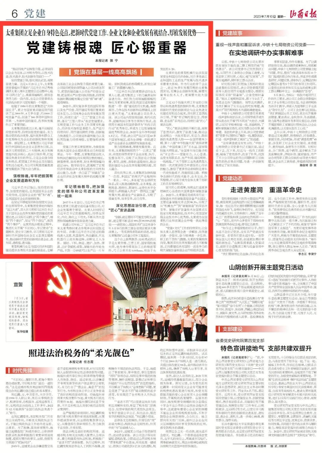 今天,山西日报刊发《党建铸根魂 匠心锻重器》文章,聚焦太重集团以习近平新时代中国特色社会主义思想为指引,认真学习贯彻党的二十大精神,充分发挥党组织政治核心、政治引领作用,扛起建设先进文化的责任,立足企业自身特色和亮点,把新时代党建工作和企业文化建设有机结合起来,实现高质量高速度发展,向着建设具有国际一流竞争力的现代智能装备制造企业目标阔步迈进。