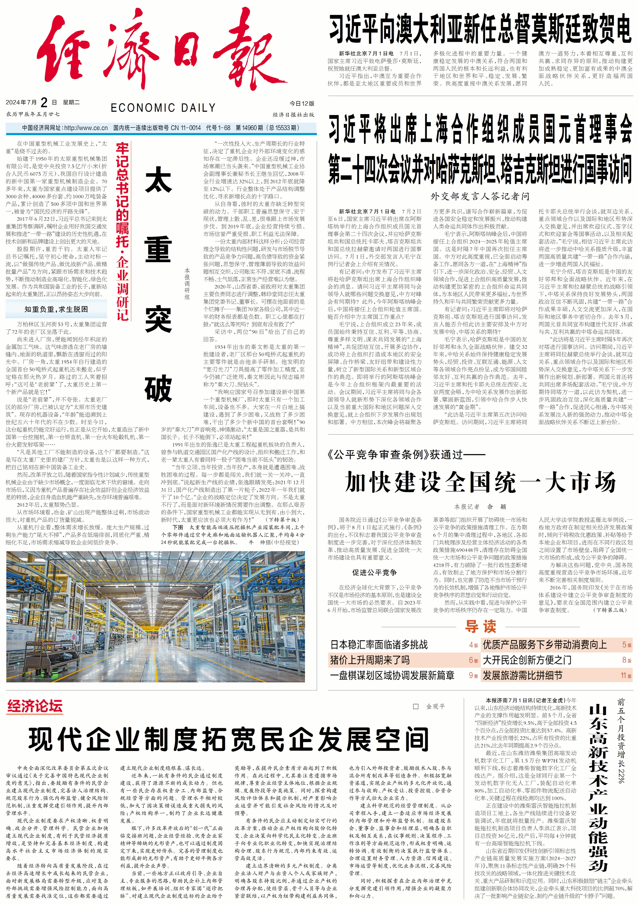 今日,《经济日报》在【牢记总书记的嘱托·企业调研记】专栏刊发文章《太重突破》,头版头条、万字报道,以太重之变、之最、之智、之绿、之速,展示太重以科技创新推动产业创新的先进做法,介绍太重推动制造业振兴崛起、实现“老树发新芽”的先进经验。