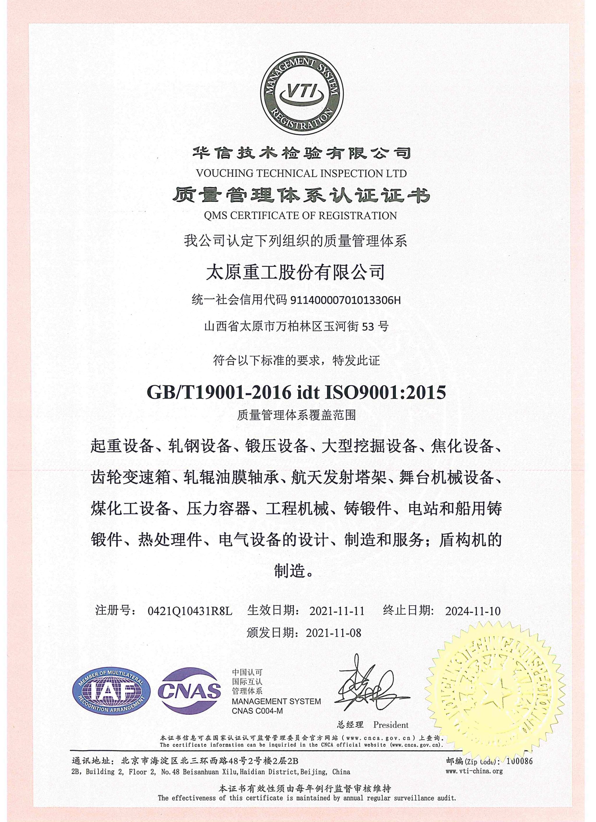 在执行ISO9001标准的基础上,太重积极推广应用可靠性管理、卓越绩效管理等先进管理方法、加强质量激励和质量改进力度,结合产品特点不断建立健全个性化的质量管理体系,通过实施“质量管理体系认证+可靠性管理体系认证”,打造质量管理体系升级版。太重荣获了多项质量管理荣誉: